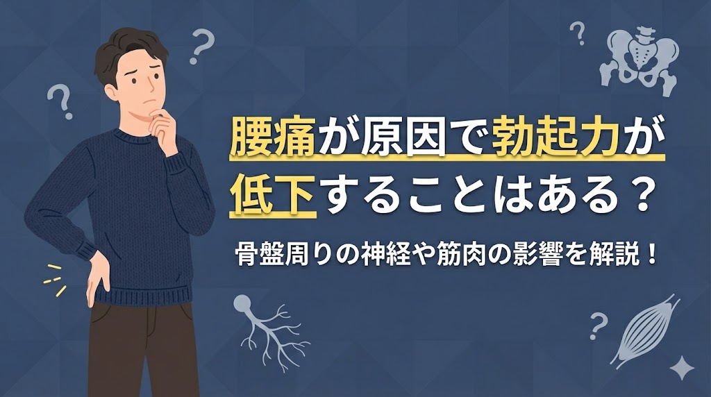 最近、腰の痛みとともに夜の元気がなくなってきたと感じていませんか。実は、腰痛が原因で勃起力が低下することは医学的に珍しいことではありません。この記事では、腰痛が原因で勃起力が低下する理由を、神経や筋肉の仕組みから詳しく解説します。腰の不安を解消して、健やかな自信を取り戻すためのヒントを見つけていきましょう。
